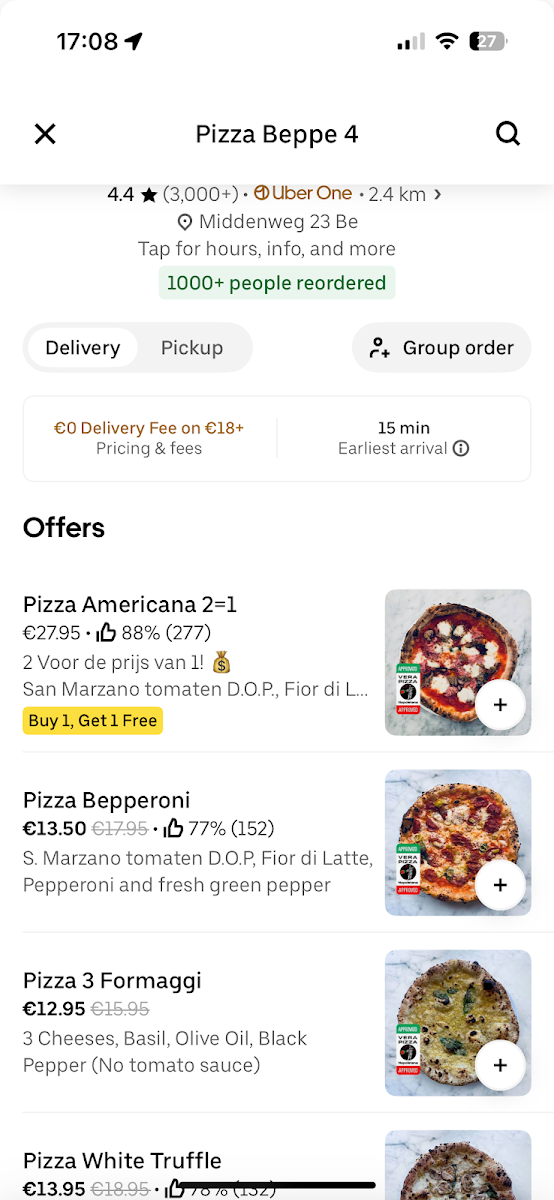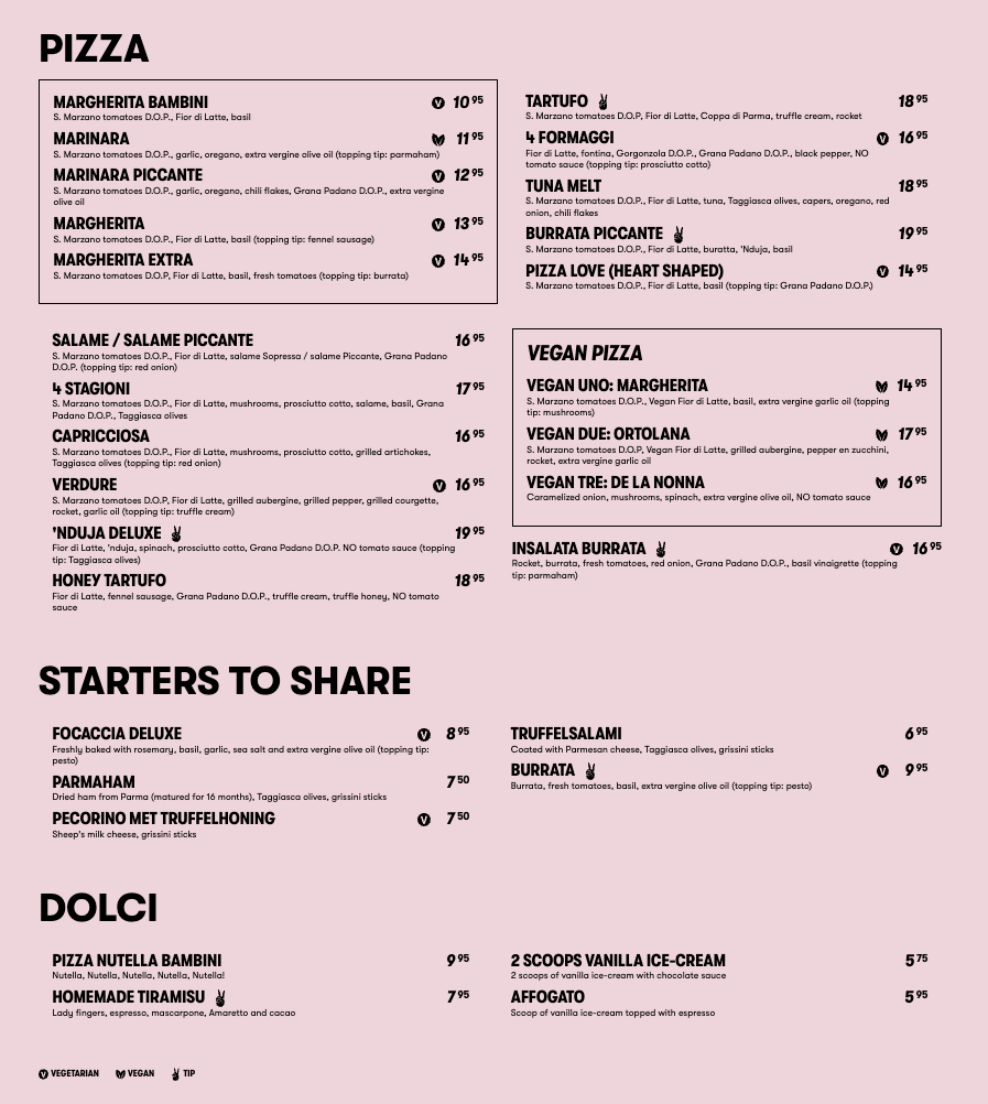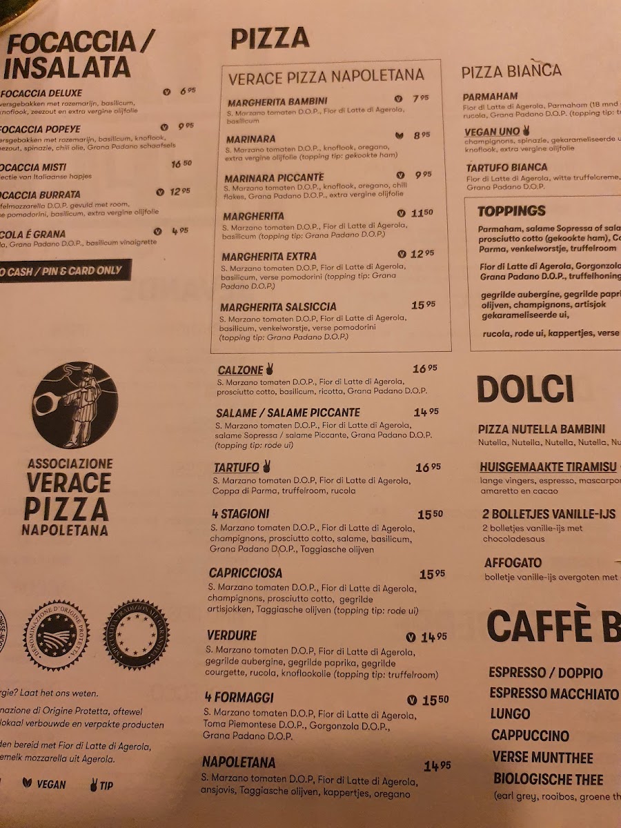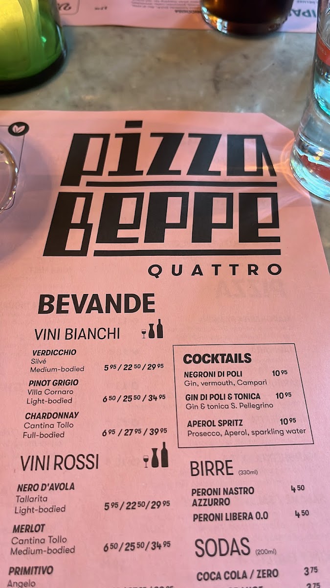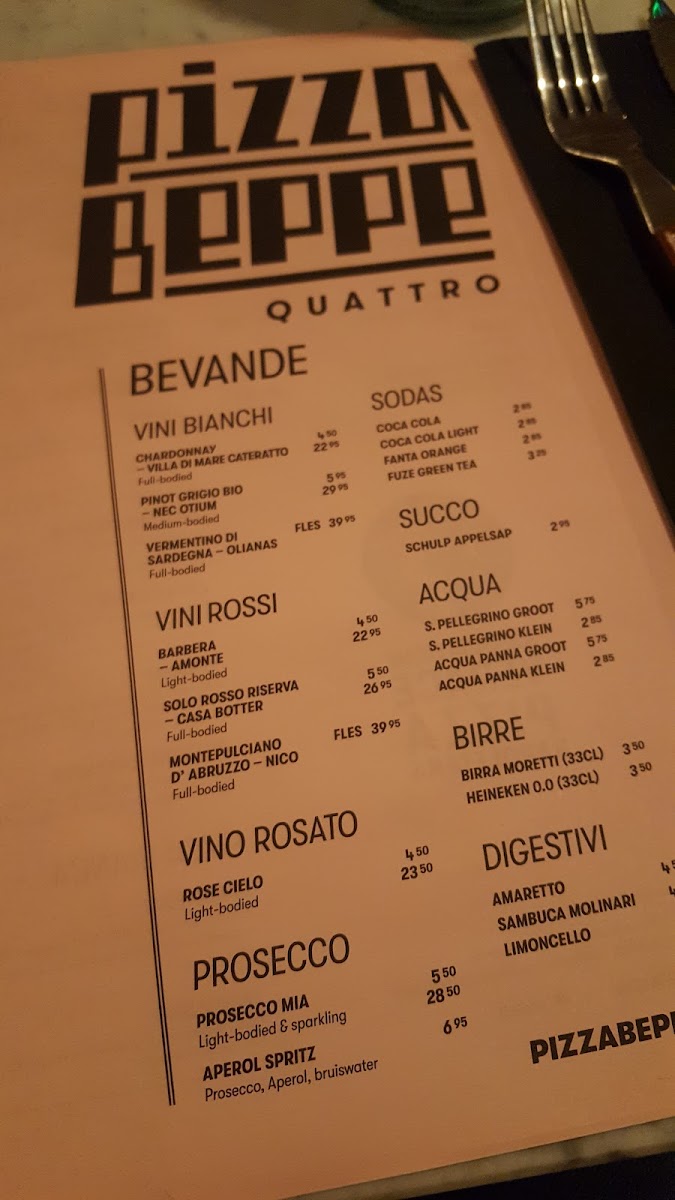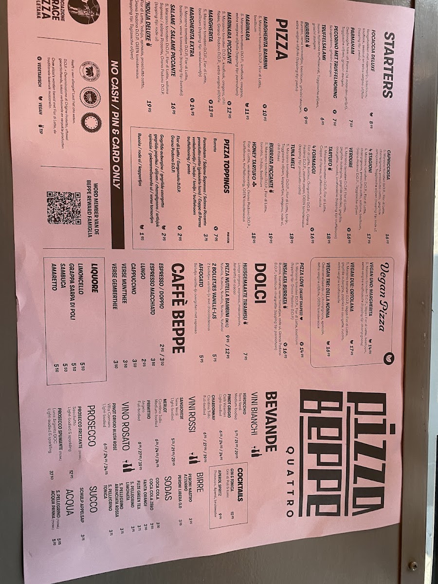 Pizza Beppe Amsterdam Oost offers a delightful and authentic taste of Italy, with a menu that showcases a wide variety of flavorful dishes. The star of the show is undoubtedly the Napoletana, a classic pizza that beautifully balances the tanginess of the tomatoes with the richness of the mozzarella. For those seeking variety, the restaurant serves a range of pizzas, from the classic Margherita to the more adventurous Diavola, with its spicy pepperoni and zesty kick. In addition to pizzas, there are delicious pasta options such as the creamy Carbonara and the hearty Bolognese. Each dish reflects the restaurant's commitment to high-quality, fresh ingredients. The prices are reasonable, offering a great value for the taste and authenticity that Pizza Beppe provides. Whether you’re in the mood for a light meal or a filling feast, the menu at Pizza Beppe delivers satisfying options that are sure to impress.
